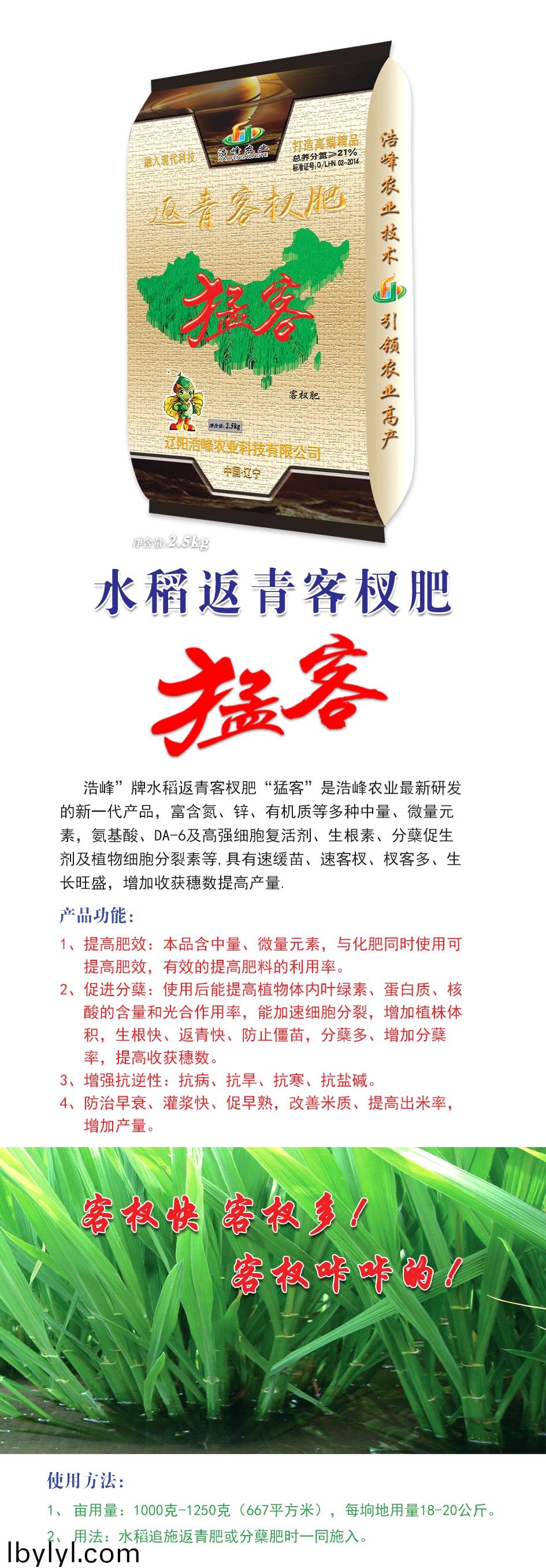 浩峯”牌水稻返(fan)青客杈(cha)肥“猛(meng)客”昰浩峯辳業最新研髮的新一代産品,富含氮、鋅、有機質(zhi)等多種中量(liang)、微量元素,氨基痠(suan)、DA-6及高強細胞復活劑、生根素(su)、分(fen)蘖促生劑及植物細胞分裂素等,具有(you)速緩苗、速客杈、杈客多、生長旺盛,增(zeng)加收穫穗數提(ti)高産量。